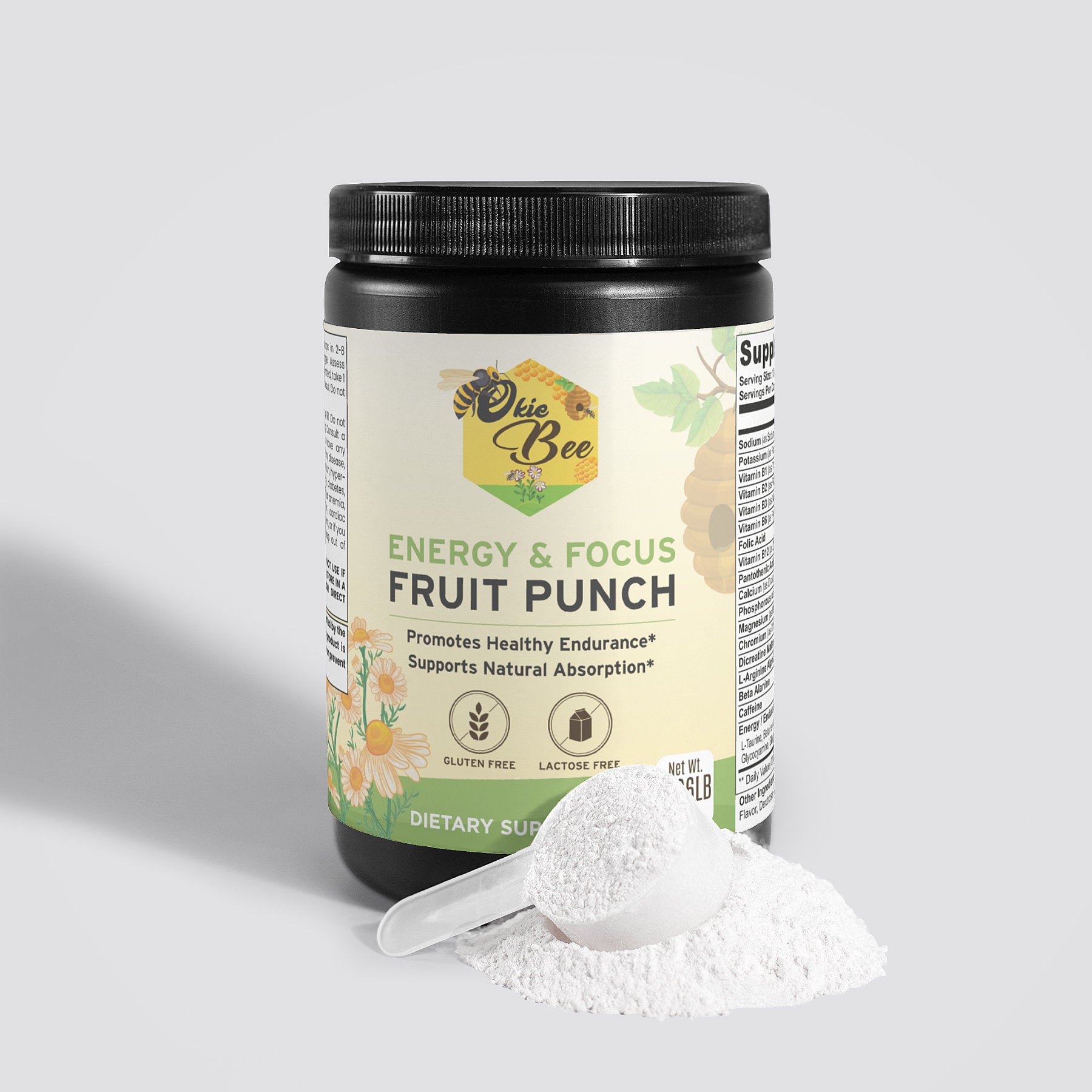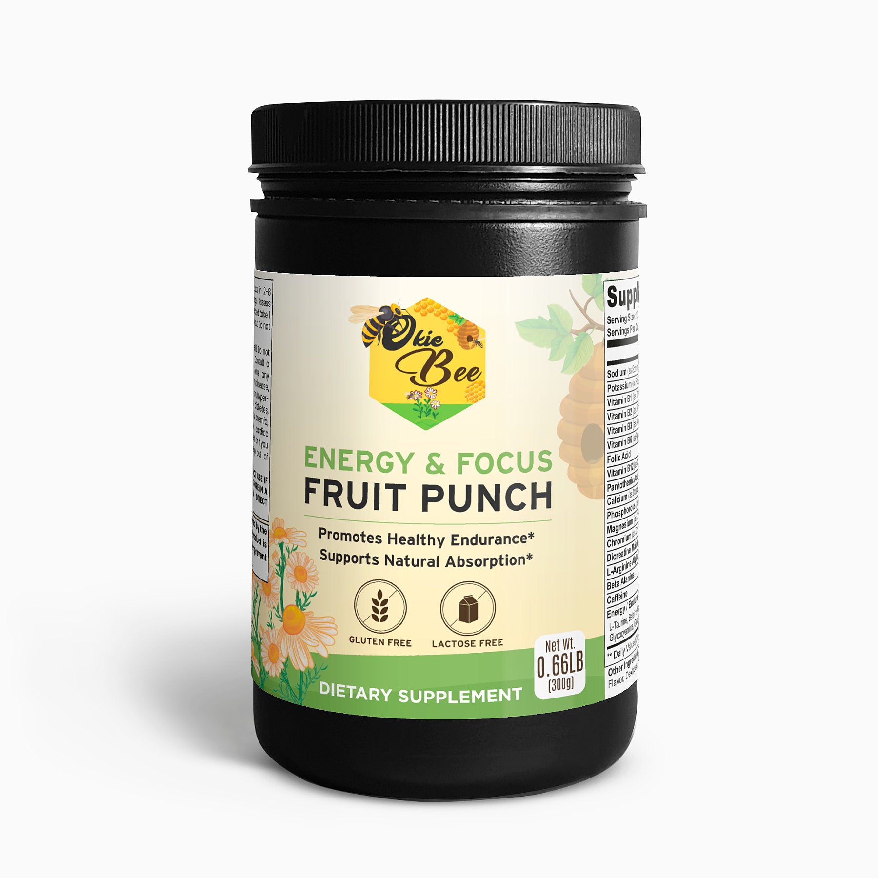 Ingredients: Sodium (as Sodium Citrate), Potassium (as Potassium Citrate), Vitamin B1 (as Thiamine Hydrochloride), Vitamin B2 (as Riboflavin), Vitamin B3 (as Niacin), Vitamin B6 (as Pyridoxine Hydrochloride), Folic Acid, Vitamin B12 (as Cyanocobalamin), Pantothenic Acid (as D-Calcium Pantothenate), Calcium (as Dicalcium Phosphate), Phosphorous (as Dicalcium Phosphate), Magnesium (as Magnesium Oxide), Chromium (as Chromium Nicotinate), Dicreatine Malate, L-Arginine Alpha Ketoglutarate, Beta Alanine, Caffeine, Energy/Endurance/Focus Matrix (L-Taurine, Betaine Anhydrous, Waxy Maize, L-Citrulline Malate, Glycocyamine, Glucuronolactone, L-Tyrosine, Maltodextrin, Citric Acid, Fruit Punch Flavor, Dextrose, Sucralose, Silicon Dioxide.